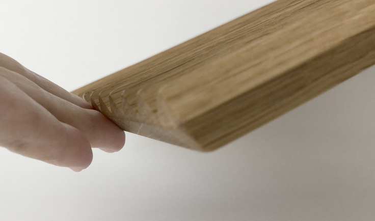 四辺のどこを持っても下に指がスッと軽く入るようになっています。小さなことですが、毎日使うことを前提に、使い勝手の良さを大切にしました。ここの切削には技術とコストを要しますが、製造にご協力くださった工場が非常に高い技術でとてもきれいに仕上げてくださいました。ここを削ることでデザインも洗練されました。